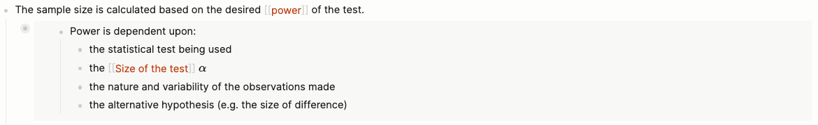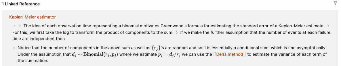 Each of these pages can be referenced using square brackets, e.g. writing ...we can use the [[Delta Method]] to estimate the variance... links a page to the “Delta Method” page.