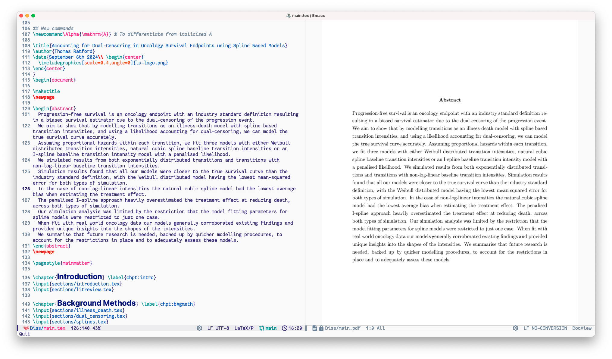 I wrote my dissertation, and all my coursework, entirely in \(\LaTeX\) using emacs.