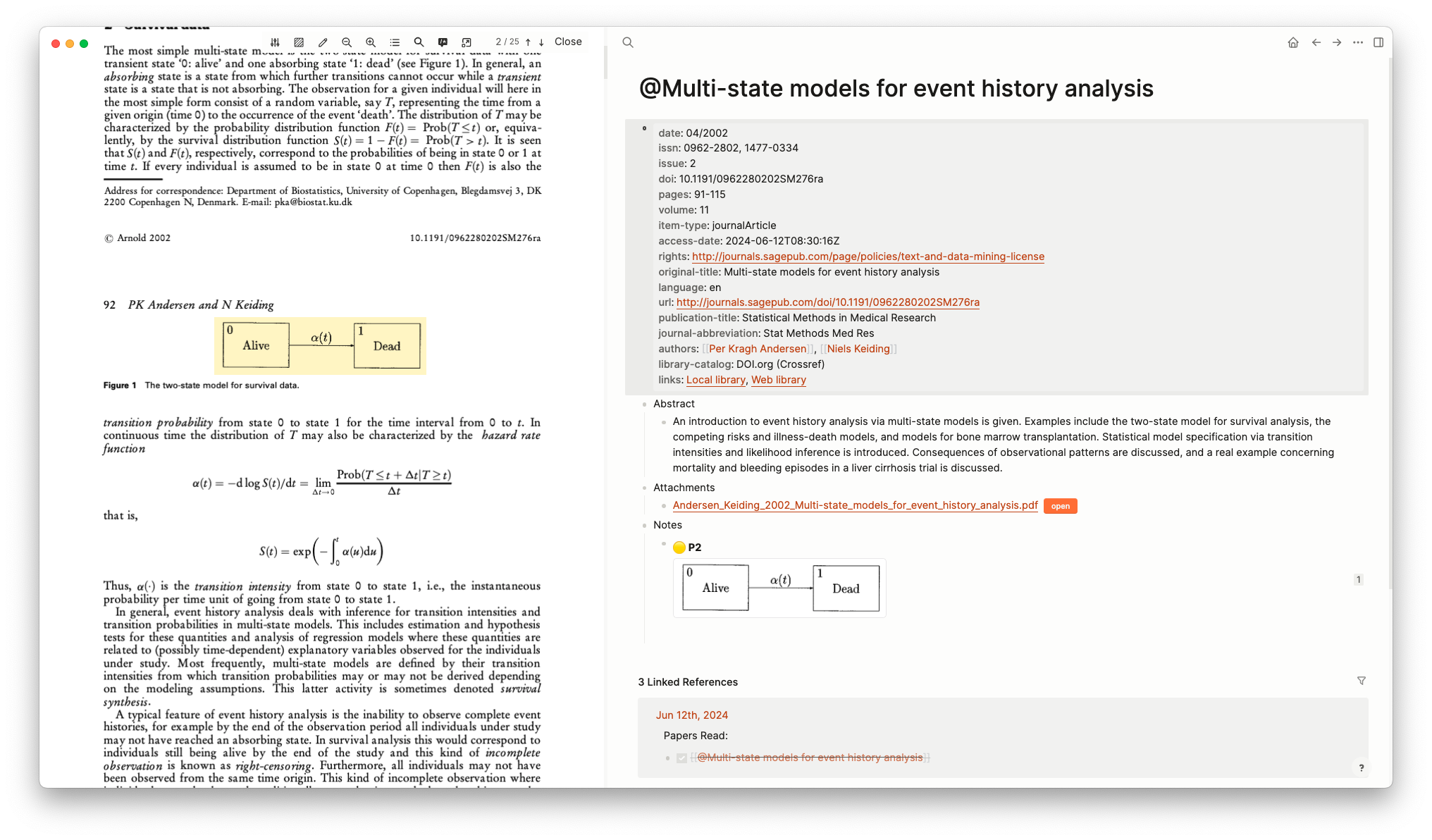 To celebrate the completion of my MSc in statistics, and my return back to the working world, I’ve written this blog post to discuss the tools I used whilst studying. Primarily, this will be focused on my use of logseq, zotero, and emacs1 to write my MSc dissertation. Logseq was my “second brain” throughout the year. A “second brain” is a concept popularised by Thiago Forte, and is a method for capturing and distilling relevant information from sources for the purpose of writing about them later on. I’m not sure my second brain truly represents this concept and it instead may be closer to the “Zettelkasten” method, in which you focus on smaller individual cards of research which are grouped together by metadata and tags. Zettelkasten is German for slip box, as the pre-digital act involved storing paper notes/cutouts in smaller, grouped boxes. Either of these methods can be implemented using a number of different apps, including (but not limited to)