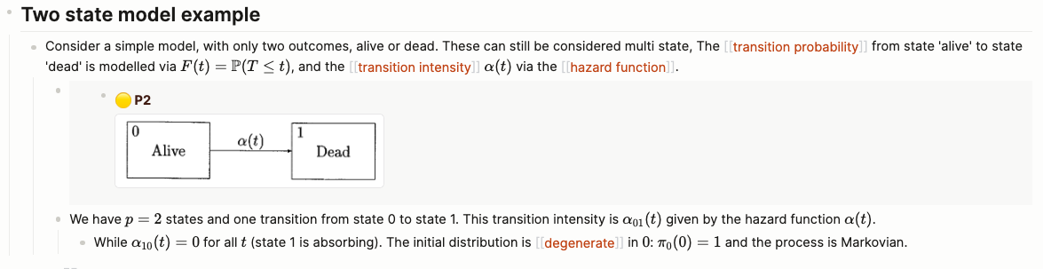 In my undergraduate degree, I took notes primarly by either rewriting the notes by hand, or printing off and highlighting notes as I listened to the lectures. This helped me stay engaged (as much as possible), but generally resulted in me having a set of useless notes when it came to exam revision. Instead my aim this time round was to write notes in Logseq with each element of the content having it’s own page. As opposed to writing up an entire lecture on 2-3 pages and then not being able to refer back to it easily later. Furthermore, having taken three years out between my undergraduate and postgraduate degree my statistics knowledge was very rusty, and I knew that being able to quickly find and recap information mid-lecture would help mitigate some of this rust. My university provided sets of lecture notes in advance to refresh my knowledge, and my second brain began on June 12th, nearly four months before my first lecture. This gave me lots of time to get used to the note taking procedure, particularly refreshing my knowledge of \(\LaTeX\).